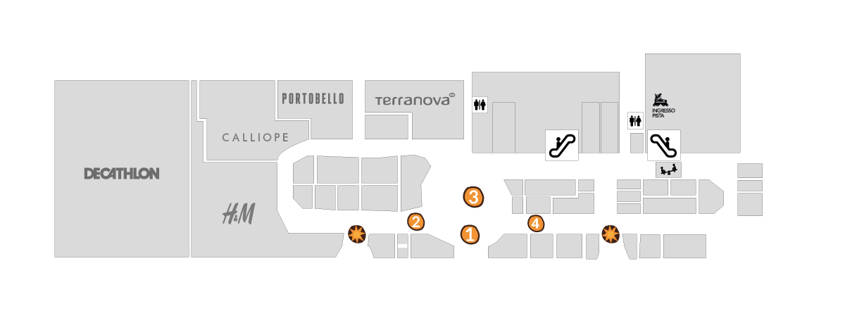 Si tratta di un’ottima posizione, in quando si trova nel corridoio principale di passaggio, davanti il Negozio Malcom e tra Gelateria e Gioielleria.