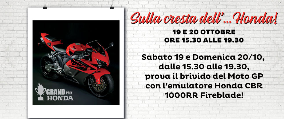 Sabato 19 e domenica 20 Ottobre dalle ore 15:30 alle ore 19:30 prova il brivido del moto GP con l'emulatore Honda CBR 1000RR Fireblade!