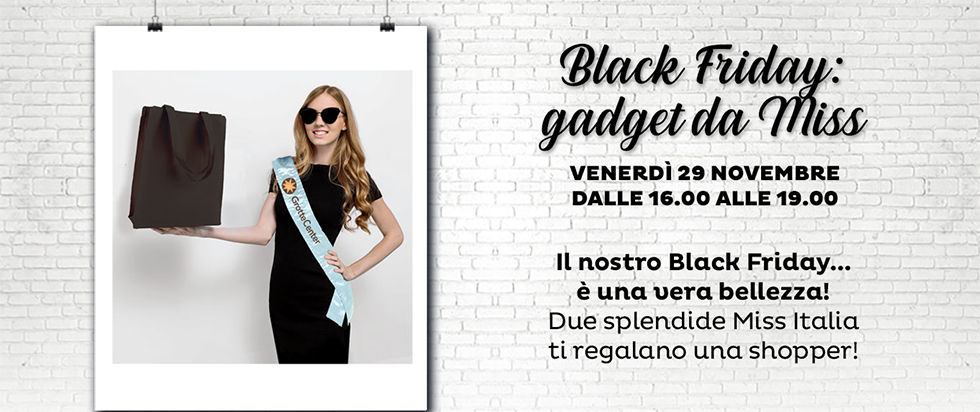Venerdì 29 Novembre, in occasione del BLACK FRIDAY, ti regaliamo delle bellissime shopper*! Cerca 2 Miss in giro per la galleria dalle 16 alle 19! Cosa aspetti? Vieni a cercare...un gadget da Miss *fino ad esaurimento scorte