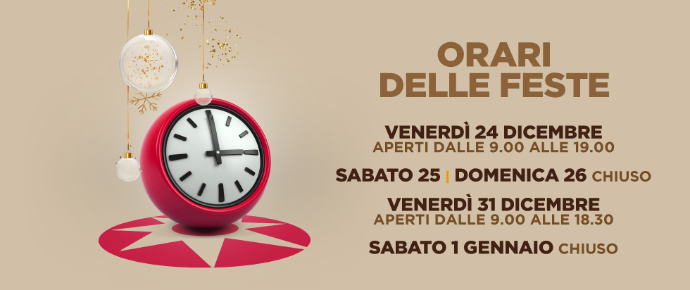 Il Centro Commerciale Grotte Center sarà chiuso sabato 25 e Domenica 26 Dicembre. Ci rivediamo lunedì 27 Dicembre con orario continuato dalle 09:00 alle 20:30. Ti aspettiamo e ti auguriamo Buone Feste!