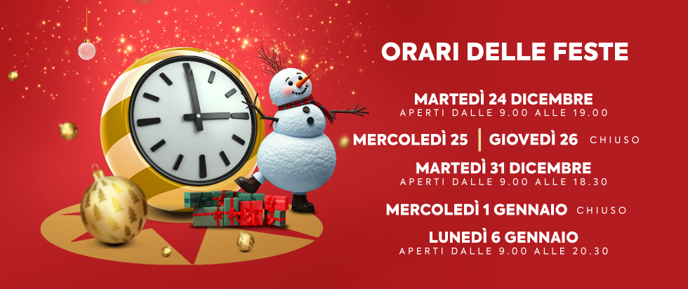 Martedì 24 Dicembre aperti dalle 9.00 alle 19.00 Mercoledì 25 e Giovedì 26 Dicembre CHIUSO Martedì 31 Dicembre aperti dalle 9.00 alle 18.30 Mercoledì 1 Gennaio CHIUSO Lunedì 6 Gennaio aperti dalle 9.00 alle 20.30