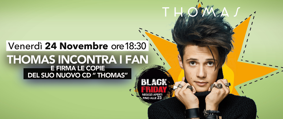 E alle ore 18:30 ci sarà un ospite speciale: THOMAS DI AMICI che firmerà le copie del suo nuovo CD "THOMAS". Non farti sfuggire l'occasione di salire sul palco, acquista il CD* presso il nostro punto vendita "Mondadori" .