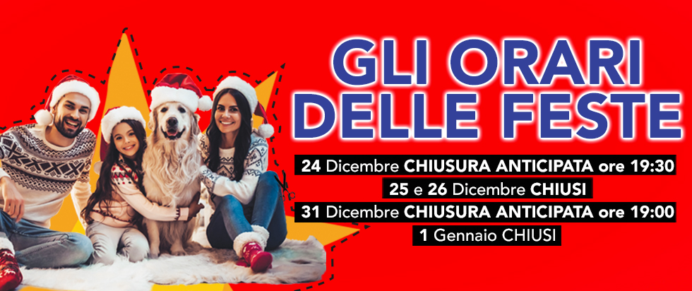 24 Dicembre CHIUSURA ANTICIPATA ore 19:30 25 e 26 Dicembre CHIUSI 31 Dicembre CHISURA ANTICIPATA ore 19:00 1 Gennaio CHIUSI