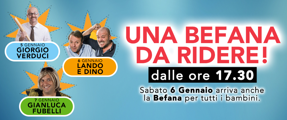 Al Centro Commerciale Grotte Center di Camerano Iniziano i saldi e torna l’evento “una befana tutta da ridere”! Il 5 Gennaio, direttamente da Zelig, Giorgio Verducci, il 6 Gennaio il duo Lando&Dino e il 7 Gennaio Gianluca Fubelli (scintilla) direttamente da Colorado Cafè!! Tutti gli spettacoli inizieranno alle ore 17:30 e il 6 gennaio per tutti i bambini arriva la befana con tante caramelle golose