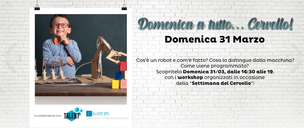 In occasione della Settimana del Cervello, l’associazione Calliope Bio-Psico-Sociale e la start up educativa TALENT srl organizzano un workshop rivolto a bambini, ragazzi e adulti dedicato al rapporto tra il funzionamento del cervello umano e l’intelligenza dei robot.