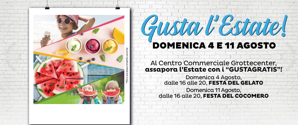 Al Centro Commerciale Grottecenter assapora l'estate con i "GUSTAGRATIS"! Domenica 4 Agosto, dalle 16.00 alle 20.00, FESTA DEL GELATO Domenica 11 Agosto, dalle 16.00 alle 20.00, FESTA DEL COCOMERO